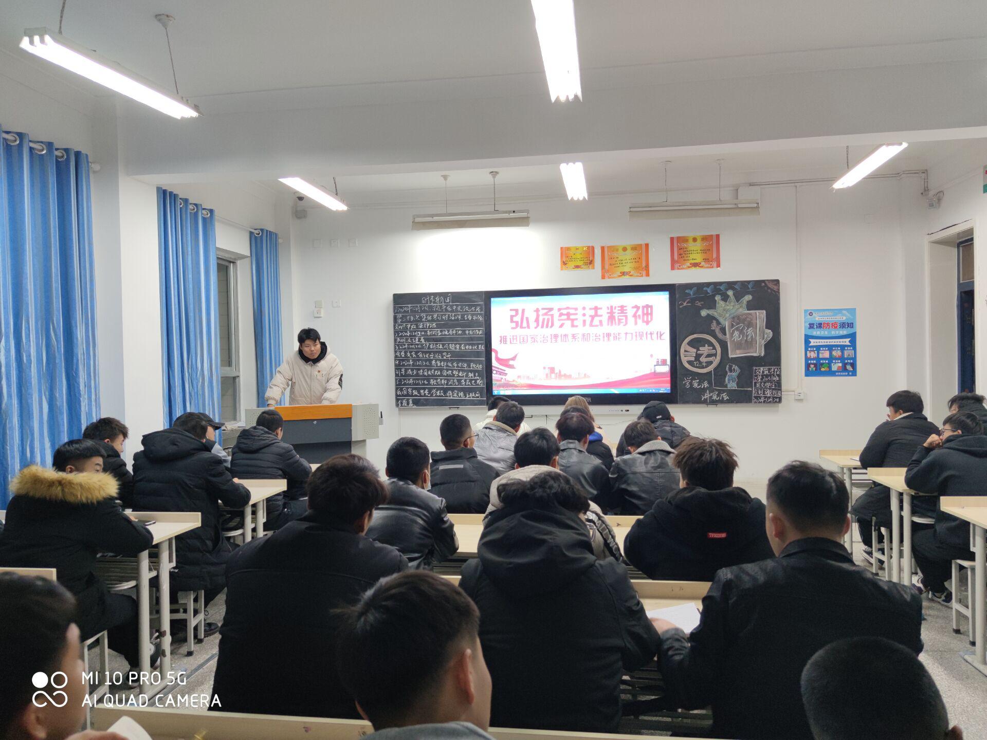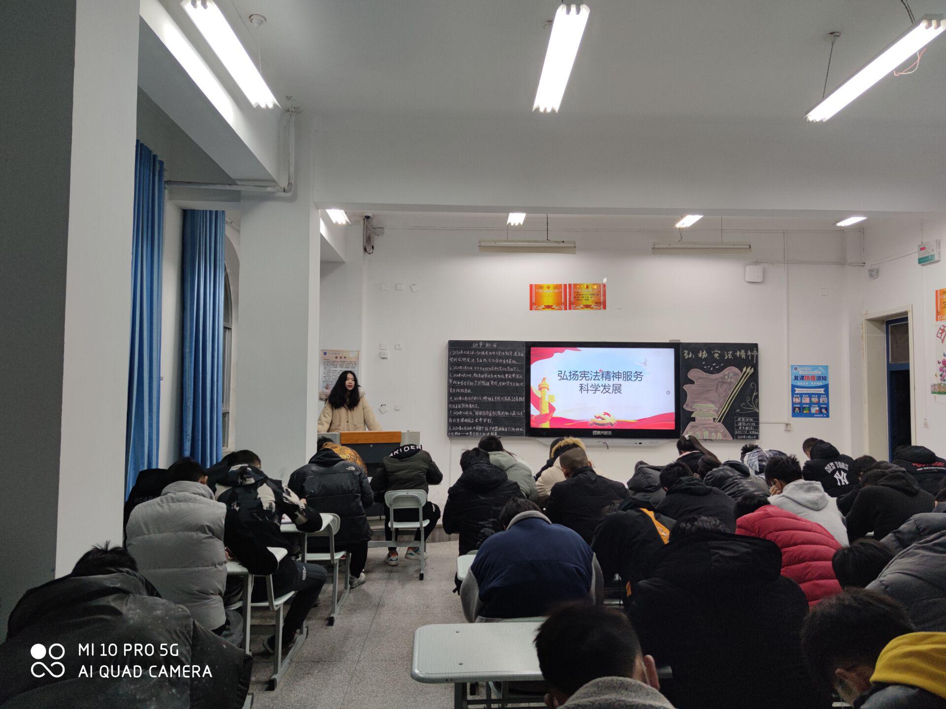 为了进一步增强同学们知法、懂法、守法能力,使大家明确宪法和法律不仅是全体公民必须遵循的行为规范,同时也是保障公民权利的法律武器,使同学们自觉地提高公民意识和法律意识、社会责任感、社会认识能力。信誉最好的十大体育平台团总支于2020年12月2日在二号教学楼举办了“弘扬宪法精神,增强法制观念”主题团课。团课由各班团支书主持,20级全体同学参加。